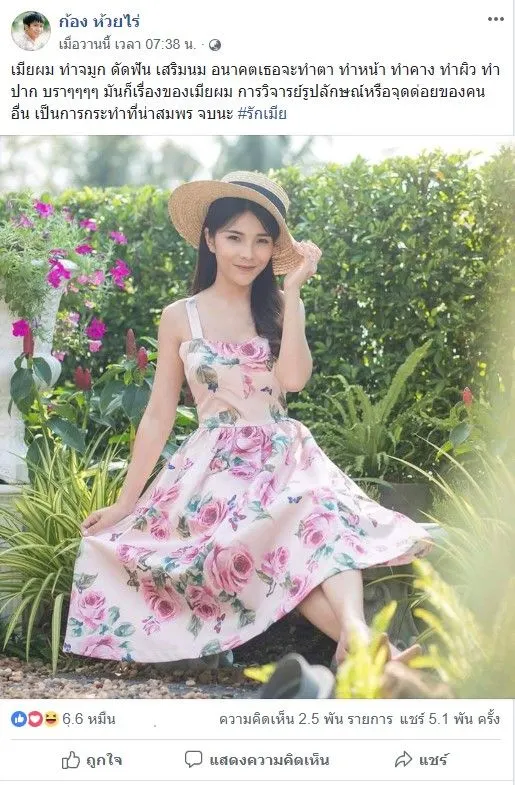 “เมียผม ทำจมูก ดัดฟัน เสริมนม อนาคตเธอจะทำตา ทำหน้า ทำคาง ทำผิว ทำปาก บราๆๆๆๆ มันก็เรื่องของเมียผม การวิจารณ์รูปลักษณ์หรือจุดด่อยของคนอื่น เป็นการกระทำที่น่าสมพร จบนะ #รักเมีย” บอกเลยว่าการไปวิพากย์วิจารณ์หน้าตาของคนอื่นนั้นมันเป็นเรื่องที่ไม่สมควรควรสักเท่าไหร่เลยนะค่าาา