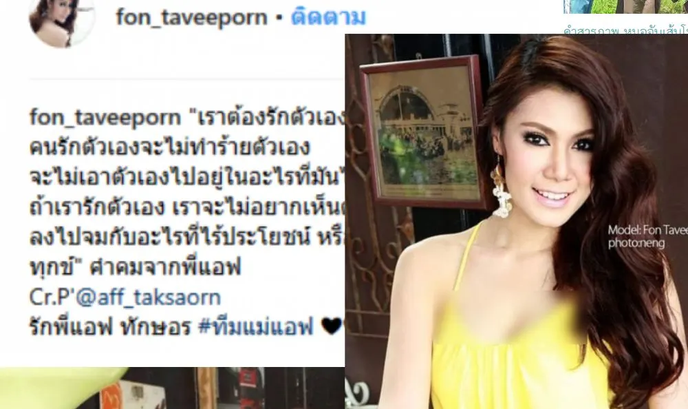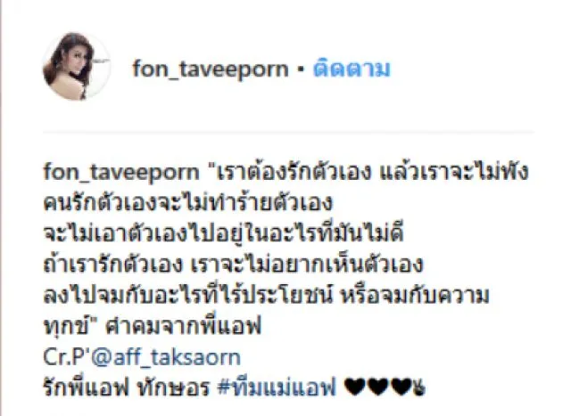 เป็นอีกหนึ่งข่าวที่เป็นประเด็นฮอตข้ามปีก็ว่าได้สำหรับนางเอกสาว แมท ภีรนีย์ หลังออกมาให้สัมภาษณ์ว่ากำลังศึกษาดูใจอยู่กับ ไฮโซสงกรานต์ เตชะณรงค์ อดีตสามีของรุ่นพี่ในวงการอย่าง แอฟ ทักษอร หลังจากที่ทั้งคู่ออกมาเปิดใจว่ากำลังคบกันอยู่นั้น ก็มีรูปหลุดของทั้งคู่ออกมาให้เห็นอยู่เรื่อยๆ เรียกได้ว่ากระแสดราม่ายังคงแรงไม่มีตกจริงๆ ส่วนทางด้าน สาวแอฟ ก็ใช้ชีวิตปกติทั่วไปและมีแฟนๆคอยให้กำลังใจอยู่ตลอด ล่าสุดนี้ สาวน้ำฝน ทวีพร อดีตแฟนสาวของ หนุ่ม ศรราม ก็ได้ออกมาโพสต์รูปตนเองลงอินสตาแกรม พร้อมระบุข้อความถึงสาวแอฟว่า เราต้องรักตัวเอง แล้วเราจะไม่พัง คนรักตัวเองจะไม่ทำร้ายตัวเอง จะไม่เอาตัวเองไปอยู่ในอะไรที่มันไม่ดี ถ้าเรารักตัวเอง เราจะไม่อยากเห็นตัวเอง ลงไปจมกับอะไรที่ไร้ประโยชน์ หรือจมกับความทุกข์” คำคมจากพี่แอฟ Cr.P’@aff_taksaorn รักพี่แอฟ ทักษอร #ทีมแม่แอฟงานนี้ไม่ต้องบอกก็รู้เลยว่า สาวน้ำฝน อยู่ข้างใคร