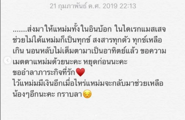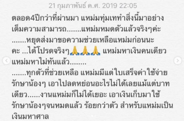 แหม่มหมดตัวแล้วจริงๆค่ะ หยุดส่งมาขอความช่วยเหลือแหม่มก่อนนะคะ ได้โปรดจริงๆ แหม่มหาเงินคนเดียว แหม่มหาเงินไม่ทันแล้ว ทุกตัวที่ช่วยเหลือ แหม่มมีแต่ใบเสร็จค่าใช้จ่ายรักษาน้องๆ เอาไปลดหย่อนอะไรไม่ได้เลยแม้แต่บาทเดียว งานแหม่มก็ไม่ได้เยอะ เอาเงินเก็บมาใช้รักษาน้องๆ จนหมดแล้ว ร้อยกว่าตัว สำหรับแหม่มเป็นเงินมหาศาล ส่งมาให้แหม่มทั้งอินบอกซ์ ในไดเรกแมสเสจ ช่วยไม่ได้แหม่มก็เป็นทุกข์ สงสารทุกตัว ทุกข์เหลือเกิน นอนหลับไม่เต็มตามาเป็นอาทิตย์แล้ว ขอความเมตตาแหม่มด้วยนะ หยุดก่อนะคะ ขออำลาภาระกิจที่รัก ไว้แหม่มมีเงินอีกเมื่อไหร่แหม่มจะกลับมาช่วยเหลือน้องๆ อีกนะคะ