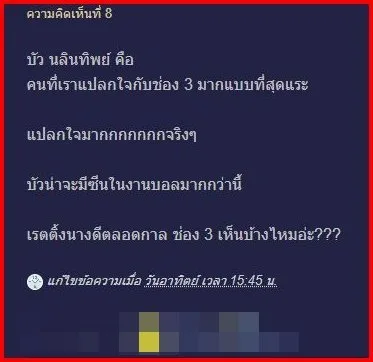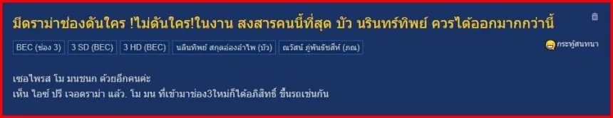 โดย สมาชิกหมายเลข 4644414 บอกว่า " เซอไพรส์ โม มนชนก ด้วยอีกคนค่ะ เห็น ไอซ์ ปรี เจอดราม่า แล้ว. โม มน ที่เข้ามาช่อง3ใหม่ก็ได้อภิสิทธิ์ ขึ้นรถเช่นกัน" พร้อมกับมีเหล่าชาวเน็ตมาแสดงความคิดเห็นกันเพียบ