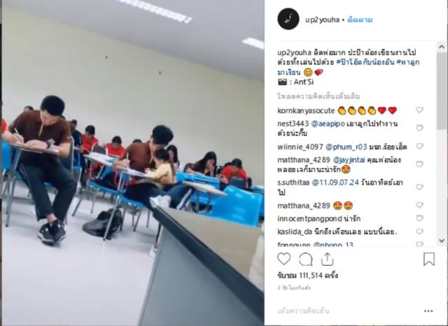 เป็นอีกหนึ่งเรื่องราวที่ชาวเน็ตแห่แชร์ และให้ความสนใจกันเป็นจำนวนมาก เมื่อมี อินสตาแกรมชื่อ up2youha ได้ออกมาโพสต์คลิปคุณพ่อหนุ่มวัยใส พร้อมทั้งได้ระบุข้อความว่า... ติดพ่อมาก ปะป๊าต้องเขียนงานไปด้วยทั้งเล่นไปด้วย #ป๊าโอ๊ตกับน้องอัน #อันนาเชาวะเลต #พาลูกมาเรียน