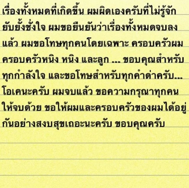 ทั้งนี้ได้มีชาวเน็ตออกมาแชร์รูปภาพกันในโลกโซเชียลของ ซึ่งเป็นรูปภาพของ "หนุ่มจิน" ที่ครั้งหนึ่งเคยออกมาโพสต์ขอโทษ "สาวหนิง" ที่เคยมีปัญหาเรื่องมือที่3 จน "สาวหนิง" จับได้แล้วกลายเป็นเรื่องราวใหญ่โตในสังคม ซึ่งเป็นเรื่องบังเอิญอย่างมากเพราะเป็นวันเดียวกันกับที่ "สาวหนิง" เข้าโรงบาลไปเมื่อไม่นานมานี้ โดยได้โพสต์เอาไว้ว่า "เรื่องทั้งหมดที่เกิดขึ้น ผมผิดเองครับที่ไม่รู้จักยับยั้งชั่งใจ ผมขอยืนยันว่าเรื่องทั้งหมดจบลงแล้ว ผมขอโทษทุกคนโดยเฉพาะ ครอบครัวผม ครอบครัวหนิง หนิง และลูก ... ขอบคุณสำหรับทุกกำลังใจ และขอโทษสำหรับทุกคำด่าครับ... โอเคนะครับ ผมจบแล้ว ขอความกรุณาทุกคนให้จบด้วย ขอให้ผมและครอบครัวของผมได้อยู่กันอย่างสงบสุขเถอะนะครับ ขอบคุณครับ"