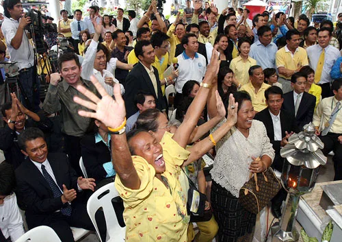 บรรยายกาศความดีใจของกลุ่มผู้สนับสนุนพรรคประชาธิปัตย์ หลังรู้คำตัดสิน ณ ที่ทำการพรรค ถนนเศรษฐศิริ เขตพญาไท