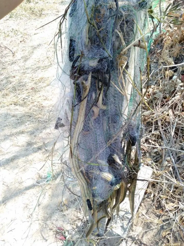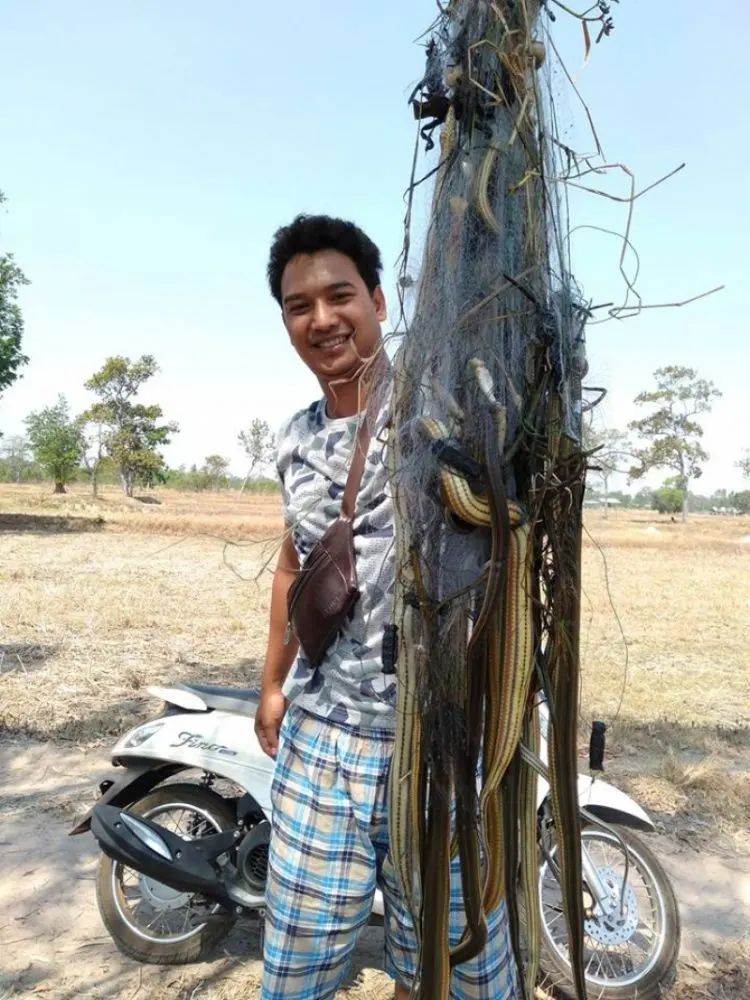 แต่พอเช้ามาผมก็ไปกู้มองที่ดักไว้ พอยกขึ้นมาก็เจองู ตอนแรกเจอแค่ 2 ตัว พอดึงมาเรื่อยๆ มันก็เพิ่มมาเรื่อยๆ จนเริ่มใจเสียละ (กลัว) สุดท้ายก็จำใจยกขึ้นมา แล้วก็เป็นอย่างในภาพแหละครับ