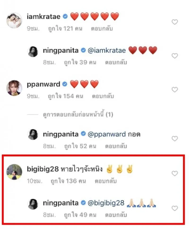 รวมถึง "บิ๊ก ศรุต วิจิตรานนท์" อดีตคนรักของ "สาวหนิง" ก็ได้เข้ามาให้กำลังใจ "สาวหนิง" เอาไว้ว่า "หายไวไวจ้ะหนิง" เรียกได้ว่าถึงแม้จะเลิกรากันไปเป็นระยะเวลานานแล้ว แต่งมิตรภาพดีๆยังคงมีให้กันเสมอ