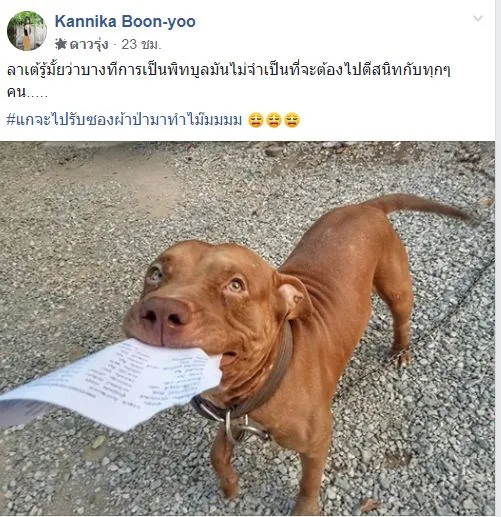 และล่าสุดผู้ใช้เฟซบุ๊ก Kannika Boon-yoo เจ้าของเจ้าลาเต้ ได้ออกมาโพสต์พฤติกรรมสุดแสบปนน่ารักของมันพร้อมแคปชั่นว่า…”ลาเต้รู้มั้ยว่าบางทีการเป็นพิทบูล มันไม่จำเป็นที่จะต้องไปตีสนิทกับทุกๆคน #แกจะไปรับซองผ้าป่ามาทำไม๊มมมม” หลังจากภาพพร้อมแคปชั่นนี้ถูกโพสต์ออกไปในกลุ่มรักหมา ได้มีชาวเน็ตจำนวนมากเข้ามาแสดงความคิดเห็นว่าบางทีเจ้าลาเต้ อาจหวังดีอยากให้แม่ของมันนั้นทำก็เป็นได้