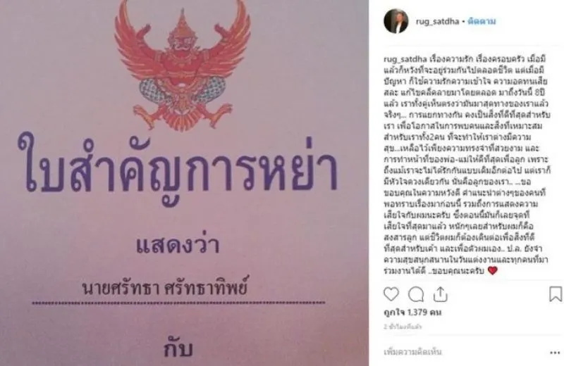 ต่อมา ครูรัก โพสต์ไอจี ภาพใบหย่า พร้อมข้อความว่า “เรื่องความรัก เรื่องครอบครัว เมื่อมีแล้วก็หวังที่จะอยู่ร่วมกันไปตลอดชีวิต แต่เมื่อมีปัญหา ก็ใช้ความรักความเข้าใจ ความอดทนเสียสละ แก้ไขคลี่คลายมาโดยตลอด