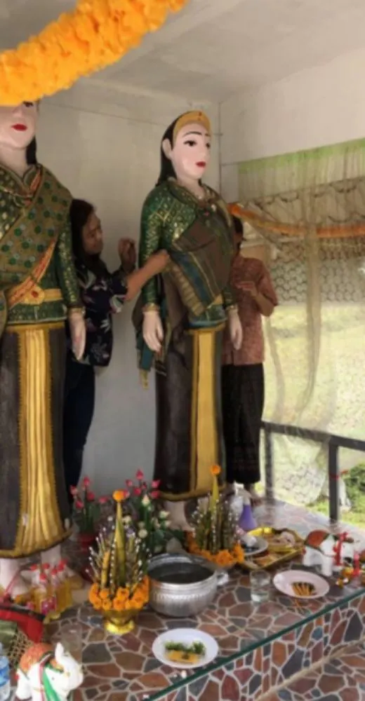 ชาวบ้านเมืองไพร กล่าวว่า ความเป็นมาในการที่ชาวบ้านได้ร่วมมือร่วมใจกันสร้างศาลปู่ย่าวังเก่าเมืองไพร (สองสาวนาคียืมฟืม)ได้มีนายผุ นาดีวีสุข ฝันว่าปู่ศรีสุทโธอยากมาอยู่ด้วย ให้ไปสร้างศาลปู่ใกล้กับบ่อน้ำเก่า ชาวบ้านก็มาร่วมมือร่วมใจกันก่อสร้าง โดยที่บริเวณก่อสร้าง เป็นที่นาของนางหนูจร โดยชาวบ้านมาขอที่ดินบางส่วน นางหนูจรก็บริจาคที่ดินให้ หลังจากนั้น ก็จะมีผู้ชายรูปร่างใหญ่ สูงผิวดำ มาเข้าฝันนางหนูจร เป็นประจำ ว่าไม่ต้องห่วงเรื่องปัจจัยที่จะนำมาก่อสร้าง และยังมากระซิบบอกเลขเด็ดเป็นประจำ แต่ห้ามเล่นหวย ให้บอกคนอื่นได้ อย่าปิดบังไว้ ชาวบ้านที่ชอบเสี่ยง ก็ถูกกันมาหลายงวดติดต่อกัน คนที่ถูกก็นำเงินมาร่วมบริจาคสร้างศาลปู่