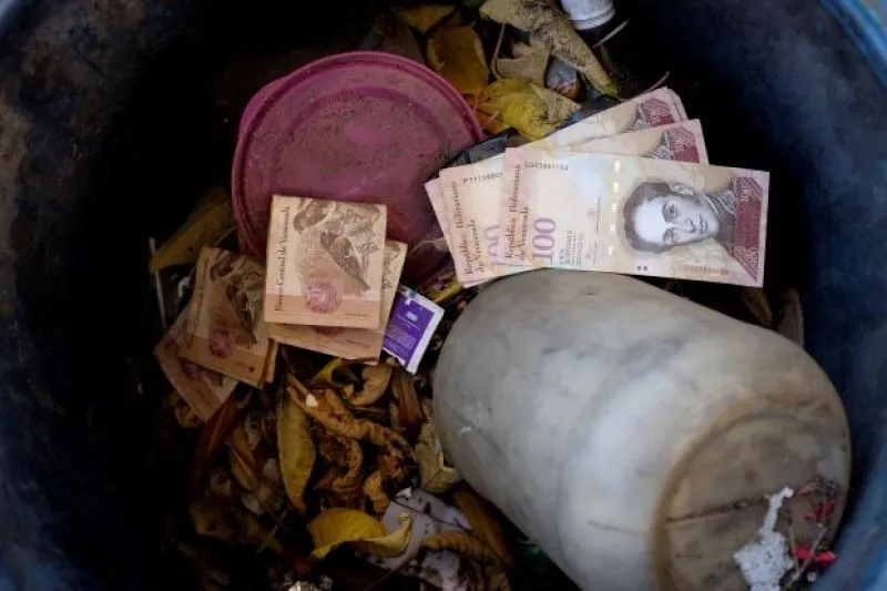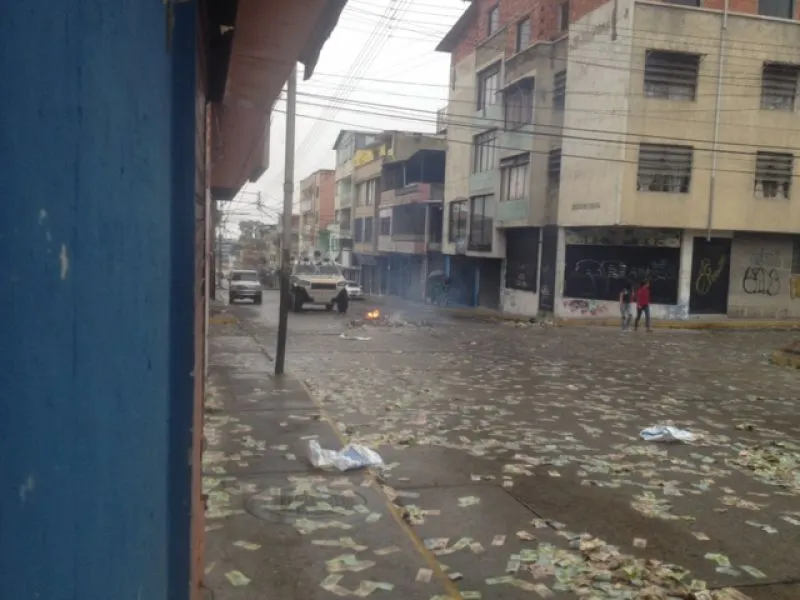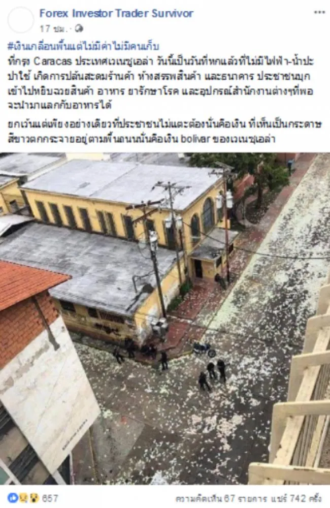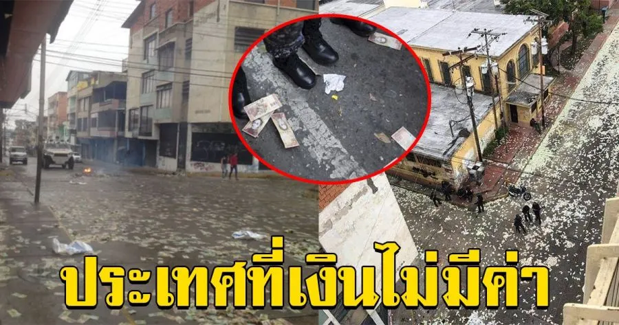 เงินเกลื่อนพื้นแต่ไม่มีค่าไม่มีคนเก็บ ที่กรุง Caracas ประเทศเวเนซูเอล่า วันนี้เป็นวันที่หกแล้วที่ไม่มีไฟฟ้า-น้ำปะปาใช้ เกิดการปล้นสะดมร้านค้า ห้างสรรพสินค้า และธนาคาร ประชาชนบุกเข้าไปหยิบฉวยสินค้า อาหาร และอุปกรณ์สำนักงานต่างๆที่พอจะนำมาแลกกับอาหารได้ ยกเว้นแต่เพียงอย่างเดียวที่ประชาชนไม่แตะต้องนั่นคือเงิน ที่เห็นเป็นกระดาษสีขาวตกกระจายอยู่ตามพื้นถนนนั่นคือเงิน bolivar ของเวเนซุเอล่า