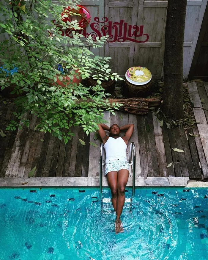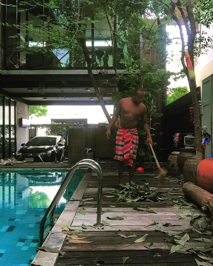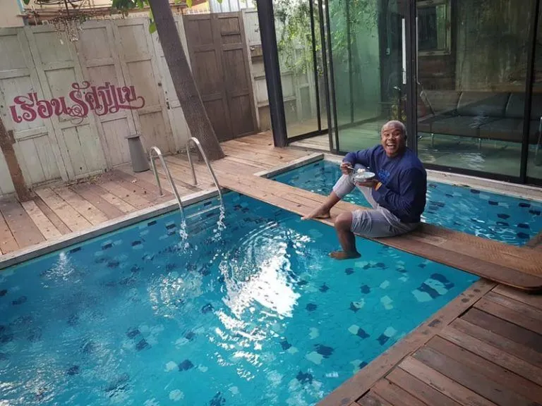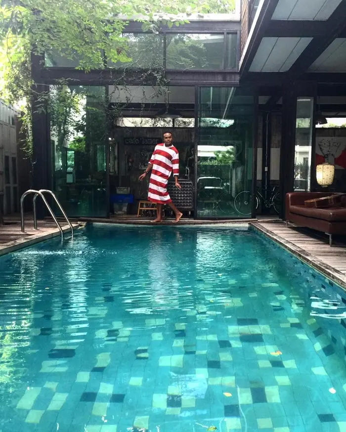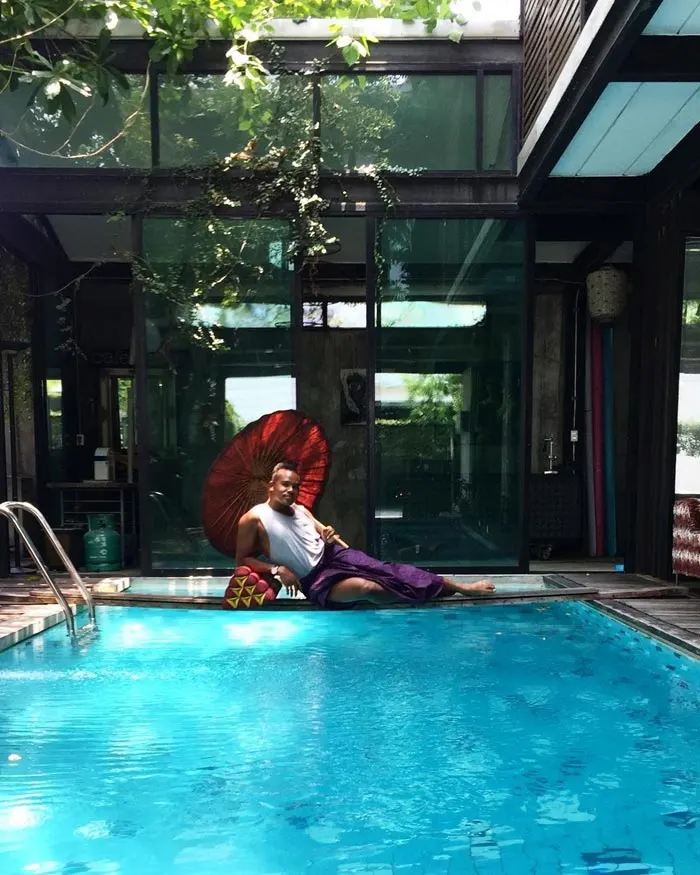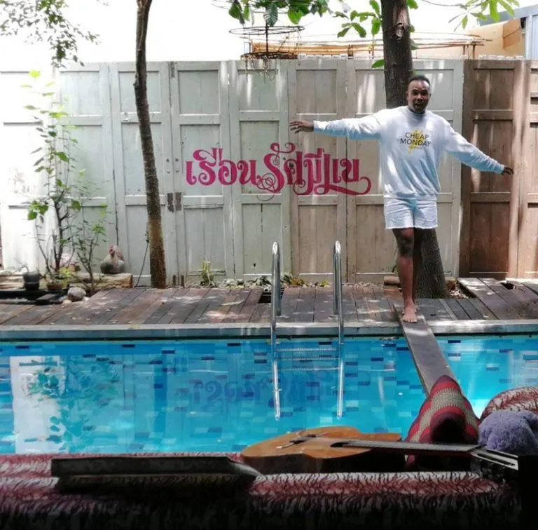 ส่วนตัวบ้านเป็นทรงยู โครงสร้างผสมผสานทั้งไม้ ปูน เหล็ก และกระจกไว้ได้อย่างพอดิบพอดี ช่วยทำให้บ้านดูมีเสน่ห์แบบหลากหลาย แถมยังสวยงามและเป็นเอกลักษณ์ โดยบริเวณตรงกลางจะเป็นสระว่ายน้ำที่รัศมีแขชอบมาพักผ่อนประจำ ส่วนฝั่งตรงข้ามบ้านเป็นพื้นที่นั่งเล่นและปลูกต้นไม้ ซึ่งทั้งพื้นและผนังของโซนนี้จะทำจากไม้ผสมกับสังกะสีเกือบทั้งหมด แถมยังเพ้นต์คำว่า “เรือนรัศมีแข” เพื่อความเก๋ไก๋ น่าสนใจด้วย