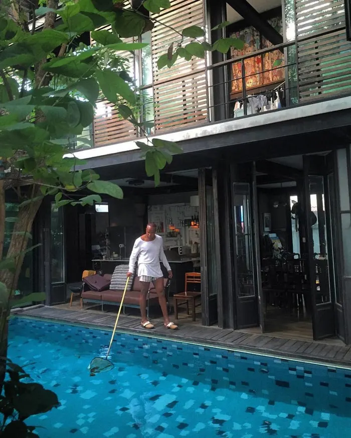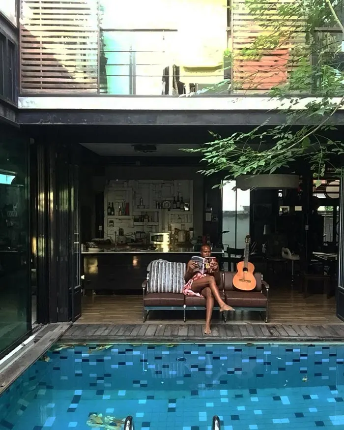 สำหรับภายในบ้านมีทั้งหมด 2 ชั้น โซนกลางบ้านเป็นห้องนั่งเล่นริมสระว่ายน้ำสุดชิล ด้านในตกแต่งสไตล์ลอฟท์เท่ ๆ เบา ๆ แถมยังเปิดโล่ง โปร่ง ทำให้เย็นสบาย ไม่อึดอัด นอกจากนี้ก็ยังซ่อนความเก๋ด้วยวอลเปเปอร์และเฟอร์นิเจอร์ล้ำ ๆ อีกทั้งยังซ่อนความอลังด้วยแชนเดอเลียร์หรู ๆ ไปในตัว เรียกได้ว่าเป็นบ้านที่มีสไตล์ มองดูแล้วกลมกล่อม ลงตัวจริง ๆ ค่ะ