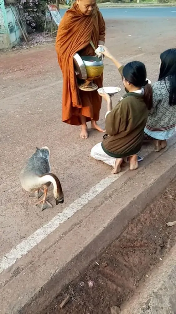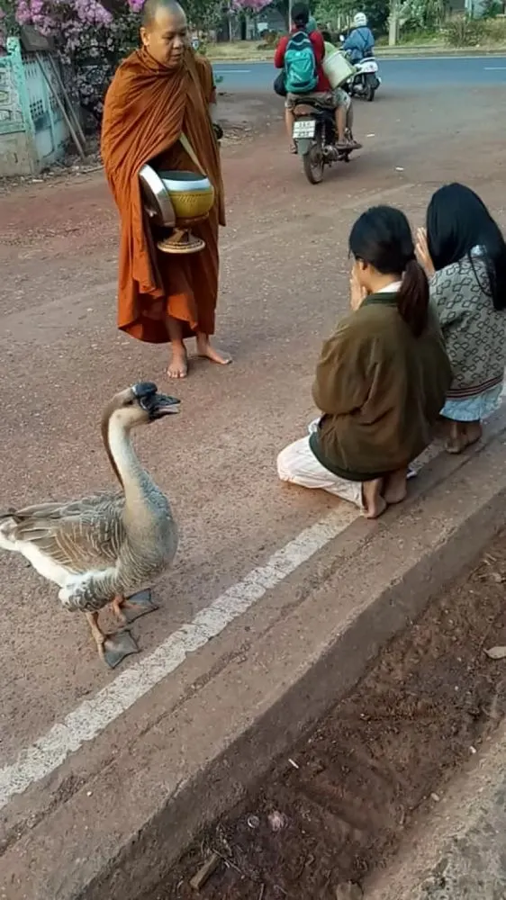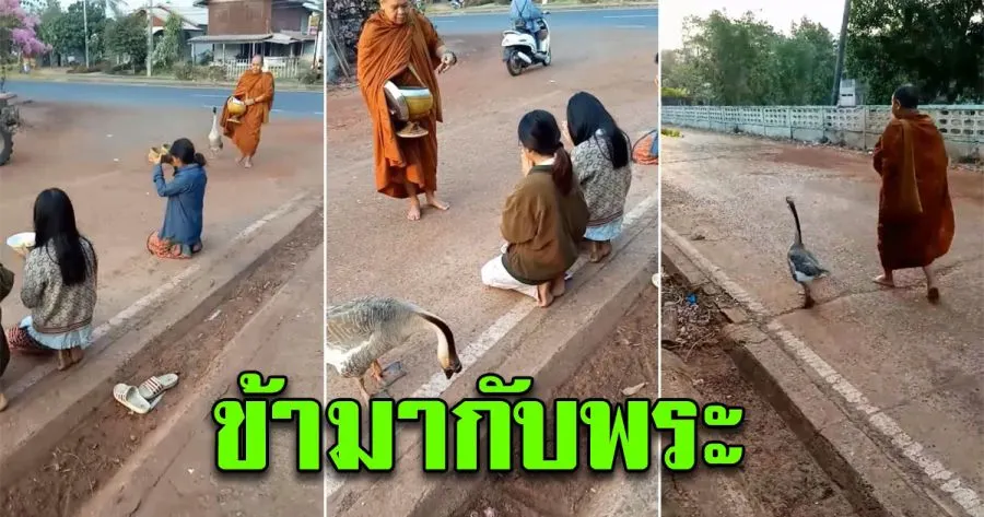 แต่ล่าสุด ทางเฟซบุ๊ก Jiraporn Turaso ก็ได้ออกมาเผยคลิปวีดีโอที่ใครเห้นก้ต้องยิ้มตาม เมื่อสัตว์ที่ตามหลวงพ่อมา ไม่ใช่ หมู หมา ที่ไหน แต่กลับเป็นห่าน สัว์คอยาวจอมโวยวาย กลับเปลี่ยนลุคส์เป็นเด็กวัดสุดเสงี่ยมเจียมตัว เดินตามพระต้อยๆๆๆ พระหยุดรับบิณฑบาตรตรงไหน มันก็จะหยุดตาม สร้างความน่ารักแก่ญาติโยมที่มารอใส่บาตรทุกๆเช้า