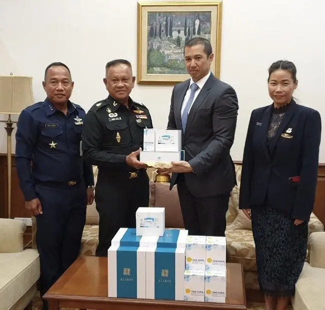 (มหาชน) (ที่ 3 จากขวา) พร้อมคณะผู้บริหาร เข้ามอบยาและเวชภัณฑ์ในเครือมูลค่ากว่า 220,000 บาท แก่สำนักงานปลัดกระทรวงกลาโหม เพื่อนำไปใช้ประโยชน์ต่างๆกับหน่วยงาน โดยมี พลเอก สมศักดิ์ รุ่งสิตา รองปลัดกระทรวงกลาโหม ให้เกียรติรับมอบ ณ สำนักงานปลัดกระทรวงกลาโหม เมื่อเร็วๆนี้