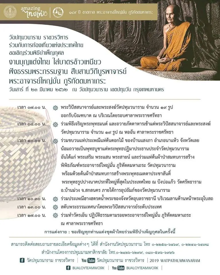 ทางการท่องเที่ยวแห่งประเทศไทย ร่วมกับวัดปทุมวนารามราชวรวิหารได้จัดกิจกรรมสืบสานฮีตโบราณอีสาน ซึ่งภายในงานท่านจะได้แต่งชุดไทยและร่วมใส่บาตรข้าวเหนียว ร่วมขบวนแห่ต้นดอกไม้ ของบ้านนาแห้ว จังหวัดเลย และยังได้สรงพระพุทธรูปจารีตสงกรานต์อีสานก่อนใคร กับประเพณีสรงน้ำพระพุทธรูปผ่านฮางฮด ของจังหวัดอุบลราชธานีอีกด้วยละครับ