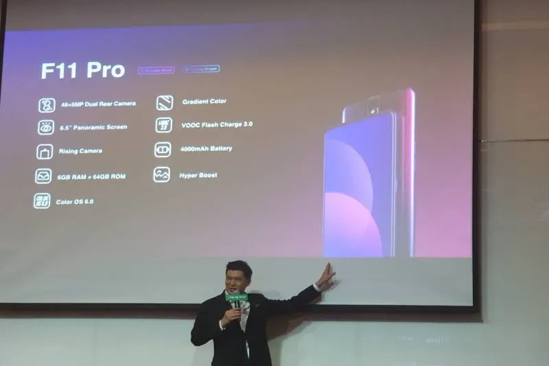 นอกจากนี้ตัวกล้องยังถูกออกแบบมาแบบป็อบ อัพ สามารถเคลื่อนขึ้นลงเวลาใช้งานได้ โดยเมื่อวันศุกร์สัปดาห์ที่ผ่านมา ได้เปิดขายในรอบแฟลซเซล ร่วมกับลาซาด้าทำสถติขายหมดเพียง 2 นาที และ 3 วันที่ผ่านมา สามารถทำยอดขายได้ถึง 80% ของเป้าหมายที่วางไว้ และมียอดจองมากกว่า รุ่นเอฟ 9 ถึง 3 เท่า โดยจะวางจำหน่ายอย่างเป็นทางการวันที่ 28 มี. ค. นี้ จึงมั่นใจว่า สมาร์ทโฟน เอฟ 11 โปร จะช่วยให้ออปโป้ยังเป็นผู้นำในตลาดมือถือถึงกลางปีนี้ โดยปีนี้จะมีมือถือออกมาทำตลาดประมาณ 10-12 รุ่น