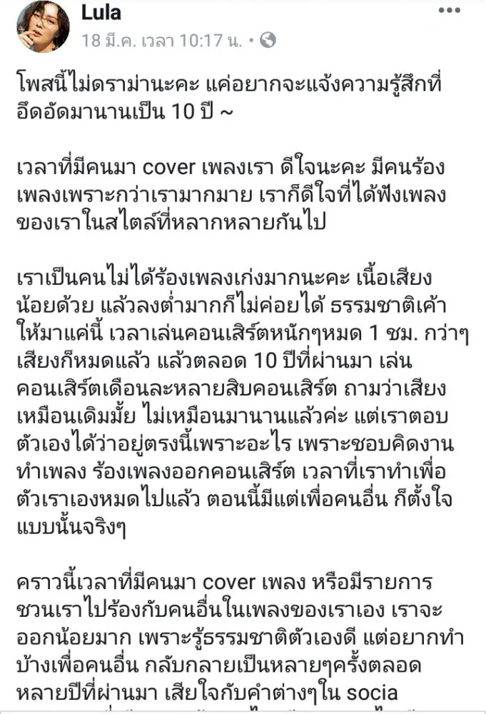โพสนี้ไม่ดราม่านะคะ แค่อยากจะแจ้งความรู้สึกที่อึดอัดมานานเป็น 10 ปี ~เวลาที่มีคนมา cover เพลงเรา ดีใจนะคะ มีคนร้องเพลงเพราะกว่าเรามากมาย เราก็ดีใจที่ได้ฟังเพลงของเราในสไตล์ที่หลากหลายกันไป
