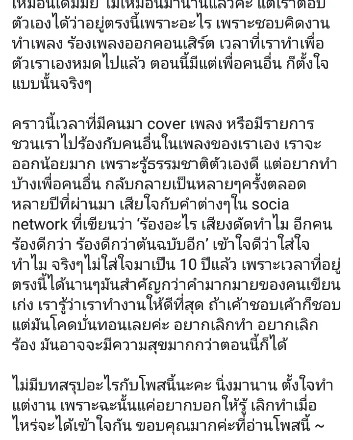 คราวนี้เวลาที่มีคนมา cover เพลง หรือมีรายการชวนเราไปร้องกับคนอื่นในเพลงของเราเอง เราจะออกน้อยมาก เพราะรู้ธรรมชาติตัวเองดี แต่อยากทำบ้างเพื่อคนอื่น กลับกลายเป็นหลายๆครั้งตลอดหลายปีที่ผ่านมา เสียใจกับคำต่างๆใน socia network ที่เขียนว่า ‘ร้องอะไร เสียงดัดทำไม อีกคนร้องดีกว่า ร้องดีกว่าต้นฉบับอีก’ เข้าใจดีว่าใส่ใจทำไม จริงๆไม่ใส่ใจมาเป็น 10 ปีแล้ว เพราะเวลาที่อยู่ตรงนี้ได้นานๆมันสำคัญกว่าคำมากมายของคนเขียนเก่ง เรารู้ว่าเราทำงานให้ดีที่สุด ถ้าเค้าชอบเค้าก็ชอบ แต่มันโคดบั่นทอนเลยค่ะ อยากเลิกทำ อยากเลิกร้อง มันอาจจะมีความสุขมากกว่าตอนนี้ก็ได้