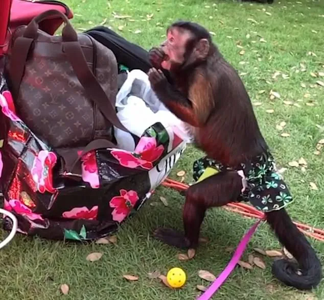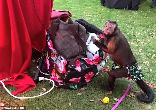 ซึ่งจากในคลิปจะเห็นว่ามีลิงตัวหนึ่งถูกจับแต่งตัวด้วยการให้สวมชุดที่คล้ายกับกระโปรง เลยสามารถเดาได้ว่าลิงตัวนี้น่าจะเป็นตัวเมีย และมันกำลังใช้มือหยิบเอาองุ่นในกระเป๋าของเจ้าของออกมากินแบบไม่สนใจว่ากำลังถูกถ่ายคลิปเลยแม่แต่น้อย