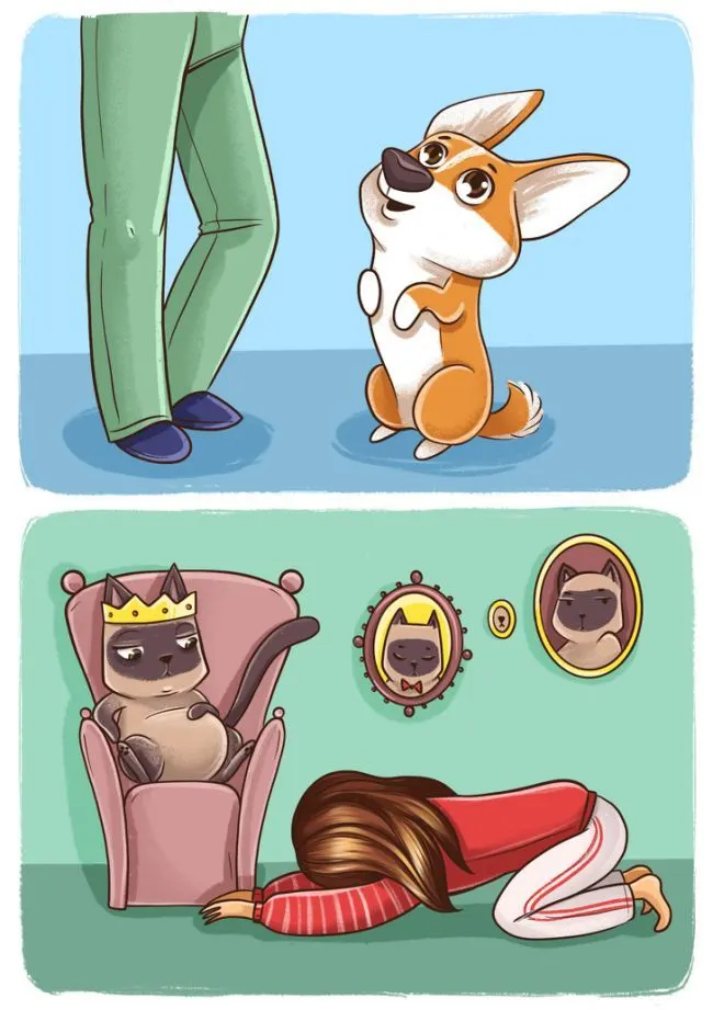 น้องหมาจะระลึกเสมอว่าคุณคือเจ้านายของมัน มันจะให้ความรักและซื่อสัตย์เสมอ ในทางตรงข้าม น้องแมวเหมียวจะรู้ว่าคุณคือทาสของมัน (คุณอาจต้องให้ความรักและซื่อสัตย์กับมันเสมอ)