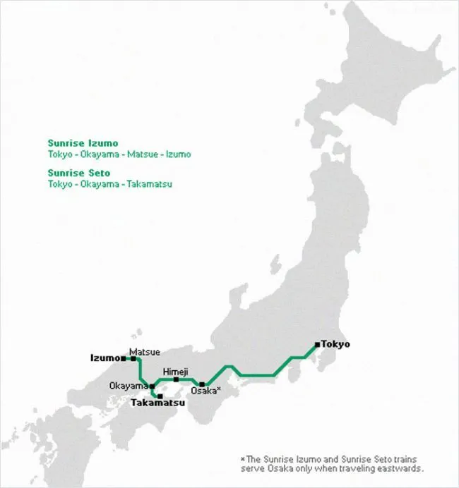 สำหรับรถไฟ Sunrise Seto ไปที่เมืองทากามัตสึ บนเกาะเกาะชิโกกุ และ Sunrise Izumo จะไปที่เมือง อิซูโมะ ในจังหวัดชิมาเนะ