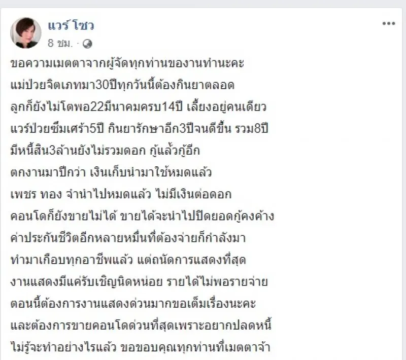 โดยเธอได้เผยข้อความว่า ขอความเมตตาจากผู้จัดทุกท่านของานทำนะคะ แม่ป่วย 30 ปี ทุกวันนี้ต้องรักษาตลอด ลูกก็ยังไม่โตพอ 22 มีนาคม ครบ 14 ปี เลี้ยงอยู่คนเดียว แวร์ป่วยซึมเศร้า 5 ปี กินยารักษาอีก 3 ปีจนดีขึ้น รวม 8 ปี มีหนี้สิน 3 ล้าน ยังไม่รวมดอก กู้แล้วกู้อีก ตกงานมาปีกว่า เงินเก็บนำมาใช้หมดแล้ว