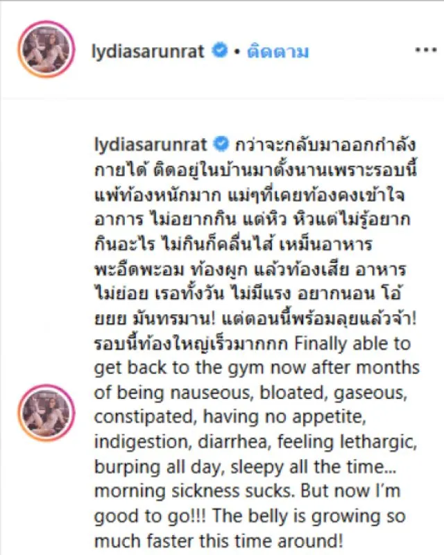 เรียกได้ว่าเป็นอีกหนึ่งครอบครัวคนในวงการบันเทิงที่น่ารักมากสำหรับนักร้องสาว ลีเดีย ศรัณย์รัชต์ วิสุทธิธาดา และสามี แมทธิว ดีน ทั้งคู่นั้นมีทายาทตัวน้อยๆด้วยกันหนึ่งคนนั่นก็คือ น้องดีแลน ที่เมื่อไม่นานมานี้ กำลังจะได้เป็นพี่ชายคนแล้ว เพราะ คุณแม่ลิเดีย ได้เผยข่าวดีผ่านทางอินสตาแกรมส่วนตัวว่าลีเดียกำลังมีลูกคนที่สอง ล่าสุดนี้ คุณแม่ลิเดีย ได้โพสต์คลิปขณะกำลังออกกำลังกายหลังจากที่แพ้อย่างหนักทำอะไรไม่ไหว ตอนนี้เลยขอฮึดลุกขึ้นมาออกกำลังกาย แต่งานนี้ก็มิวายโดนดราม่าเมื่อมีชาวเน็ตเข้ามาแสดงความคิดเห็นมากมายถึงการออกกำลังว่า ห่วงแต่หุ่นแต่ไม่ห่วงลูก บ้างก็ว่าให้เบาๆห่วงลูกในท้อง เรื่องราวจะเป็นอย่างไรต่อเอาเป็นว่าเราไปชมพร้อมๆกันเลยค่ะ