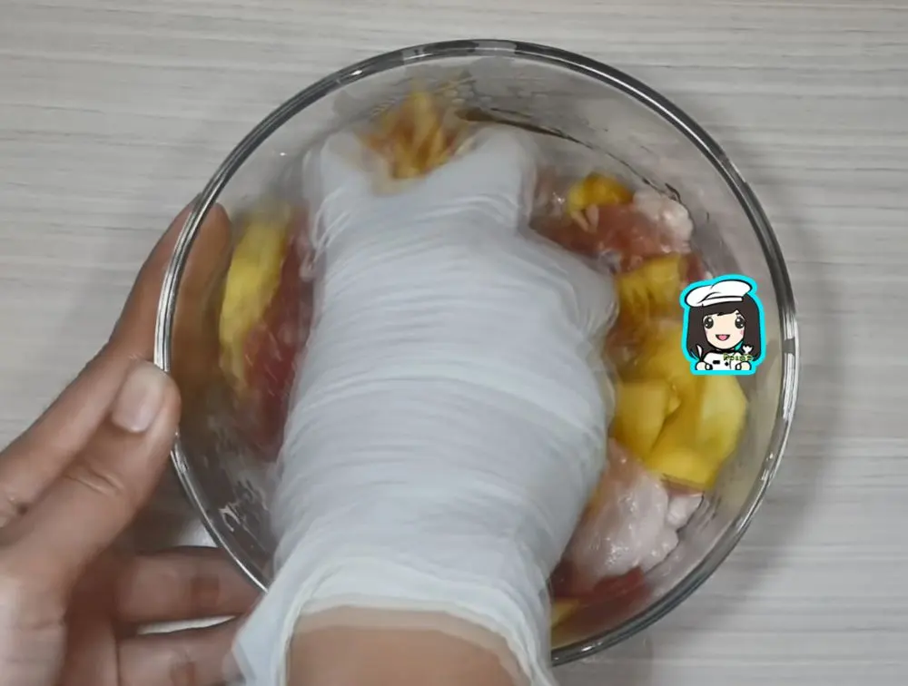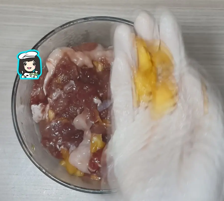 1.หั่นเนื้อวัว หมักด้วยน้ำมันหอยและน้ำมันอย่างละ 1 ชต. หั่นสับปะรดเป็นชิ้นเล็กๆ ใส่ในชามเนื้อขยำส่วนผสมหมักกับเนื้อประมาณ 10-15 นาที