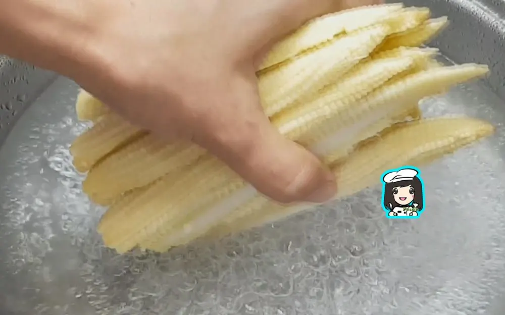 3.ตั้งน้ำให้ร้อนใส่เกลือป่น น้ำมันพืช น้ำเดือดใส่ข้าวโพดอ่อนลงไปลวก พอสุกตักขึ้นน๊อกน้ำเย็น พักไว้