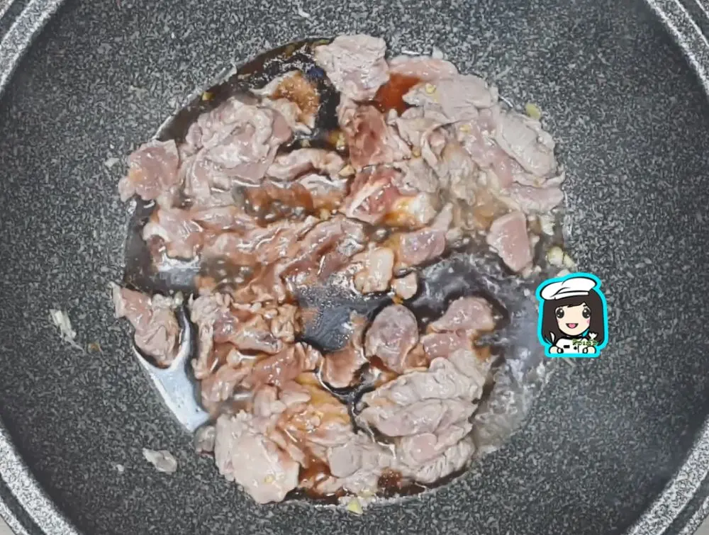 4.เตรียมกระทะใส่น้ำมันพืชผัดกับกระเทียมสับให้หอม ใส่เนื้อที่หมักไว้ลงไปผัดพอให้เนื้อสะดุ้งไฟ ปรุงรสด้วยซอสที่