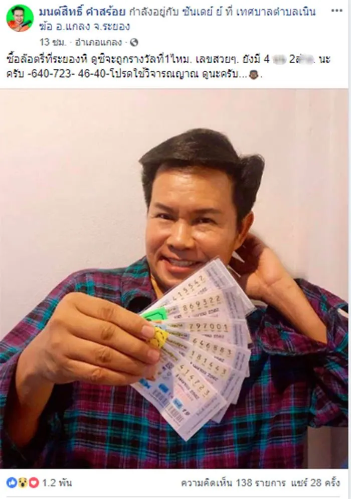 เมื่อวันที่ 30 มีนาคม ที่ผ่านมา มนต์สิทธิ์ คำสร้อย จัดหนักโชว์ลอตเตอรี่ผ่านเฟซบุ๊ก มนต์สิทธิ์ คำสร้อย พร้อมกับแคปชั่นใบ้เลข 640-723- 46-40 ในส่วนของเลขท้ายในลอตเตอรี่ คือ 42, 22, 01, 83, 43, 23