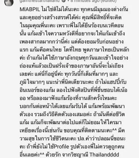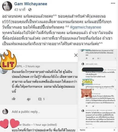 ถ้าไม่แฮปปี้กับอินเนอร์ของแก้ม ลองไปฟังศิลปินที่พี่ชื่นชอบได้เน้อ หรือลองมาฟังแก้มร้องที่งานสักครั้งไหมคะ บอกกันต่อหน้าได้เลย แก้มรับได้ แก้มพร้อมพัฒนาตัวเอง รวมถึงวิธีคิดตัวเองเสมอค่ะ ถ้ามันดีต่ชีวิตแก้ม แก้มจะพัฒนาต่อไปแต่ก้ไม่ยอมให้ใครมาเหยียดเรื่องนี้เช่นกัน ขอบคุณที่ติตตามนะคะ มีความสุขในการใช้ชีวิตนะคะ ปล. คำว่าปลอมนี่ขอนะคะ ถ้าพี่ยังไม่ใช้ Profile รูปตัวเอง พี่ไม่ควรดูถูกคนอื่นเลยค่ะ ด้วยรัก จากวิชญาณี Thailand”