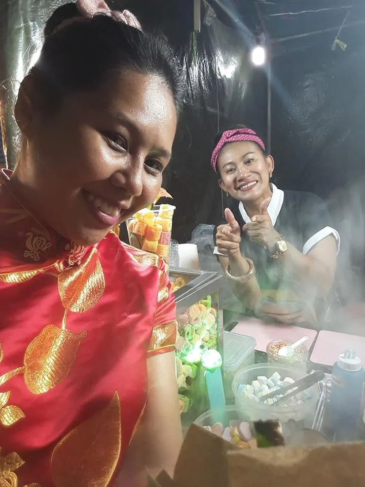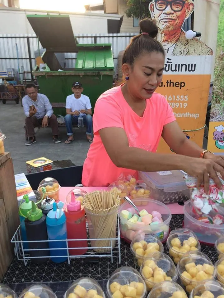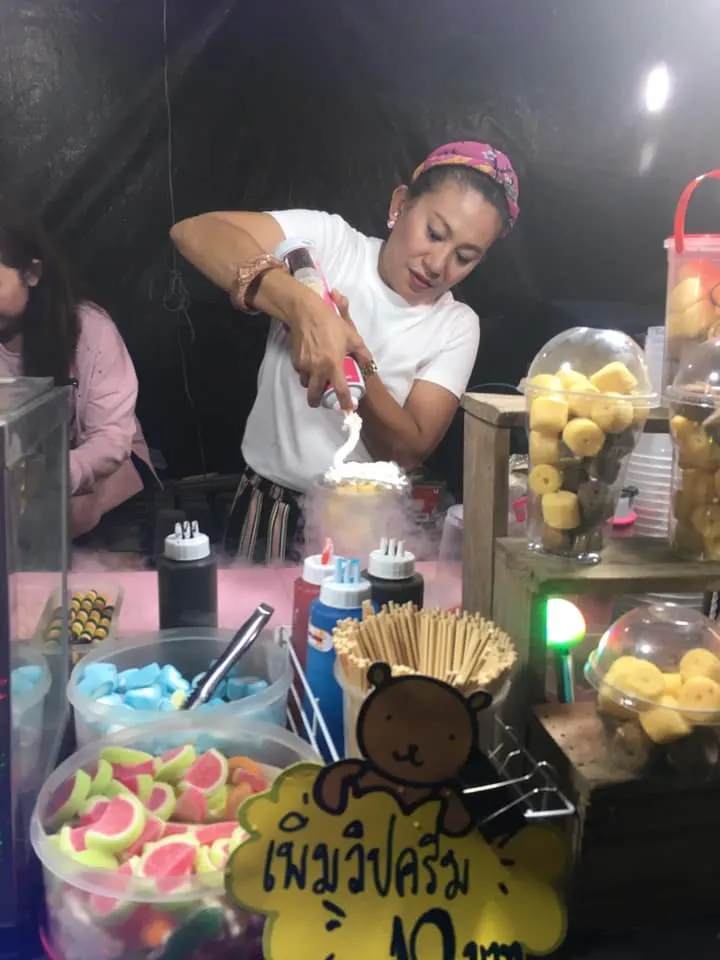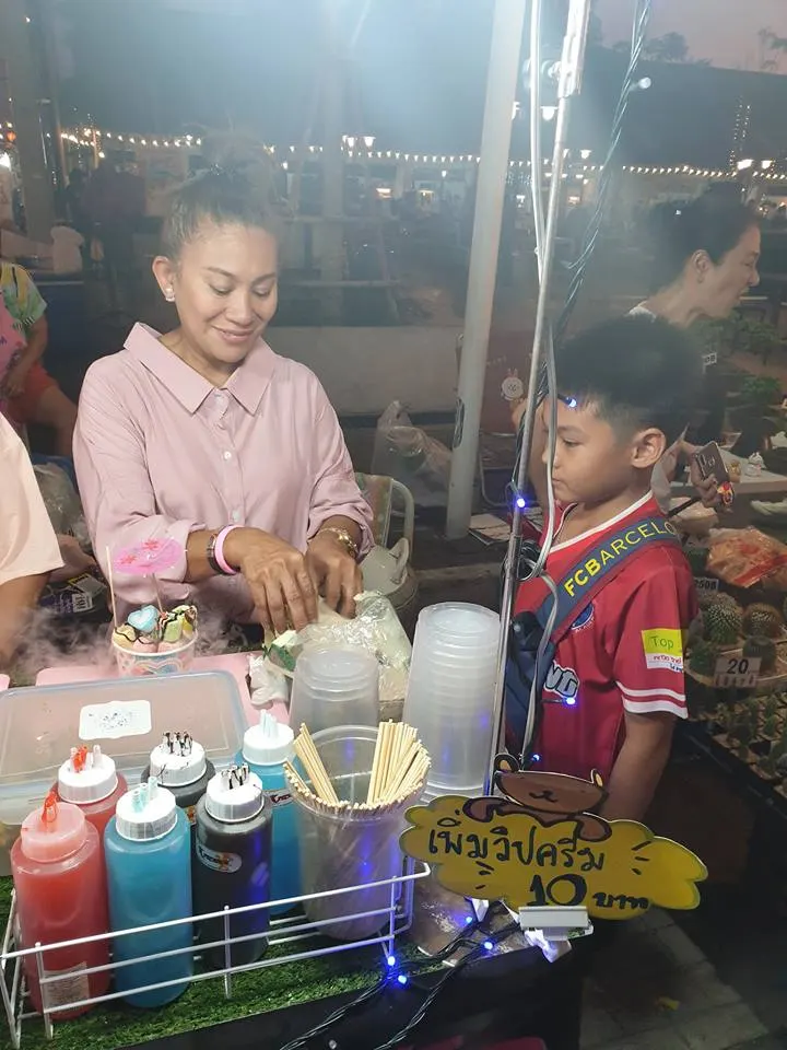 จอย : "คือแรกๆเกิดจากการไปช่วยเขาก่อน พอขายดีเราก็รู้สึกสนุก หลังๆเขาก็เริ่มจะให้เงินเรา แต่เราก็เกรงใจ ไม่อยากจะไปเอาเงินเขา แต่เราก็คิดว่า ถ้าเราไม่ได้เงินเราจะทำยังไงเพราะไหนจะค่าเหนื่อยค่ากิน ค่าน้ำมันที่เราต้องไป เพราะฉะนั้นเราก็คิดที่จะทำอะไรสักอย่าง ไปอยู่คู่กับพี่เขา ตอนแรกๆไม่มีอะไรเลยก็เอาเสื้อผ้าผู้หญิงมาขาย อยู่ใกล้ๆกัน ขายมาขายไปวันนึงรายได้ดีมาก ประมาณ 2-3 หมื่นเลย แล้วส่วนมากเวลาว่างเรามีเยอะ แต่หลังๆเราก็เปลี่ยนมาขายขนม เพราะเสื้อผ้าขายไปเยอะๆมันจม มันก็ได้กำไรแหละแต่มันน้อย พอมันจะหมดเราก็ต้องไปหาเพิ่ม แล้วเงินมันก็ต้องหมุนอยู่อย่างนั้นเราก็ไม่ได้ใช้สักที ก็เลยคิดว่าหันมาขายขนมดีกว่า"