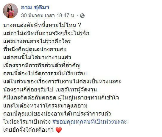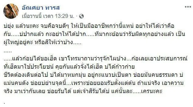 โดยในเฟซบุ๊ก อัณศยา ทารส อดีตผู้จัดการส่วนตัวของ อาม ชุติมา ได้ออกมาโพสต์ว่า “บ่ยุ่ง แล้วนะคะ จบคือจบดี ๆ ให้เป็นมืออาชีพกว่านี้แหน่ อย่าให้ได้เว่าคือกัน…..บ่ปากแล้ว กะอย่าให้ได้ปาก…..ทีมากะย้อนว่ารับผิดทุกอย่างแล้ว เป็นผู้ใหญ่อยู่ค่ะ หรือสิให้เว่าบ้าง…..