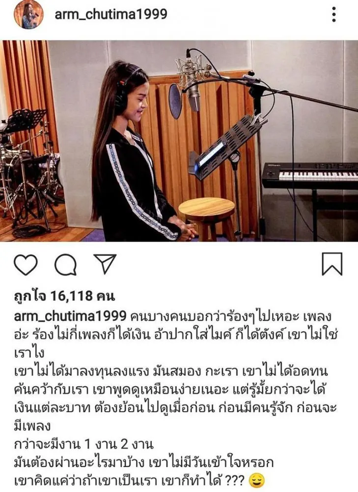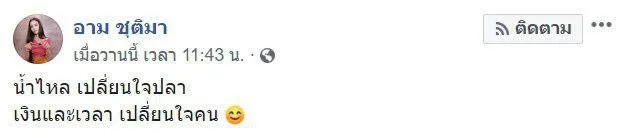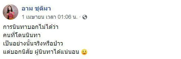 ขณะที่ อาม ชุติมา ก็ได้โพสต์เฟซบุ๊กว่า “น้ำไหล เปลี่ยนใจปลา เงินและเวลา เปลี่ยนใจคน” และยังมีข้อความที่ อาม โพสต์คล้ายตัดพ้อใน IG อีกว่า “คนบางคนบอกว่าร้อง ๆ ไปเหอะ เพลงอะ ร้องไม่กี่เพลงก็ได้เงิน อ้าปากใส่ไมค์ ก็ได้ตังค์ เขาไม่ใช่เราไง เขาไม่ได้มาลงทุนลงแรง มันสมอง กะเรา เขาไม่ได้อดทน ค้นคว้ากับเรา เขาพูดดูเหมือนง่ายเนอะ แต่รู้มั้ยกว่าจะได้เงินแต่ละบาท ต้องย้อนไปดูเมื่อก่อน ก่อนมีคนรู้จัก ก่อนจะมีเพลง กว่าจะมีงาน 1 งาน 2 งาน มันต้องผ่านอะไรมาบ้าง เขาไม่มีวันเข้าใจหรอก เขาคิดแค่ว่าถ้าเขาเป็นเรา เขาก็ทำได้ ???”