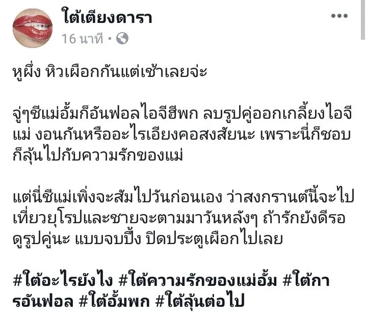 หลังจาก เพจใต้เตียงดาราได้ออกมาเผยว่าา ….. หูผึ่ง หิวเผือกกันแต่เช้าเลยจ่ะจู่ๆชีแม่อั้มก็อันฟอลไอจีฮีพก ลบรูปคู่ออกเกลี้ยงไอจีแม่ งอนกันหรืออะไรเอียงคอสงสัยนะ เพราะนี่ก็ชอบก็ลุ้นไปกับความรักของแม่แต่นี่ชีแม่เพิ่งจะสัมไปวันก่อนเอง ว่าสงกรานต์นี้จะไปเที่ยวยุโรปและชายจะตามมาวันหลังๆ ถ้ารักยังดีรอดูรูปคู่นะ แบบจบปึ้ง ปิดประตูเผือกไปเลย #ใต้อะไรยังไง #ใต้ความรักของแม่อั้ม #ใต้การอันฟอล #ใต้อั้มพก #ใต้ลุ้นต่อไป