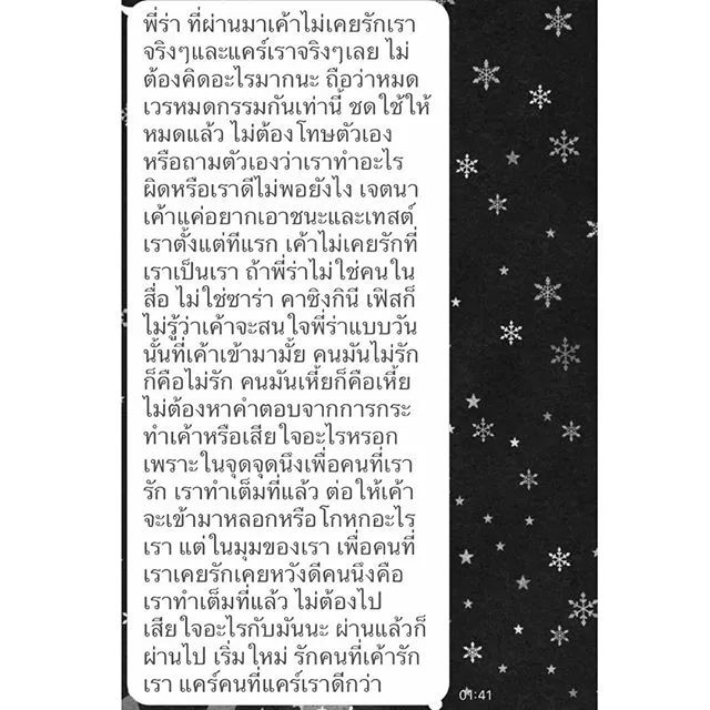 หลังจากนั้นซาร่าก็ออกมาโพสต์ภาพข้อความกำลังใจที่ส่งมาให้เธอ และไม่อยากให้ซาร่าโทษตัวเองด้วยกับเรื่องที่เกิดขึ้น ถือว่าหมดเวรหมดกรรม คนมันไม่รักก็คือไม่รัก ไม่ต้องไปหาคำตอบจากการกระทำ ต่อให้เขามาหลอกหรือโกหกอะไรเรา แต่ในมุมของเราคือทำเต็มที่แล้ว อยากให้ซาร่าเริ่มต้นใหม่ รักคนที่เขารักเราดีกว่า