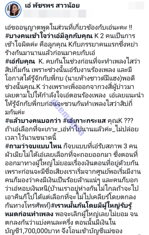 ล่าสุด “แฟนเก่า” ของ ก้อง ห้วยไร คือ “เอ๋ พัชรพร สาวน้อย” ได้ออกมาชี้แจงความจริงต่าง ๆ ที่ทุกคนกำลังเข้าใจผิดกับเรื่องราวที่เกิดขึ้นในกระแสตอนนี้ เราไปดูโพสต์ที่เธอออกมาชี้แจงกันเลยจร้า