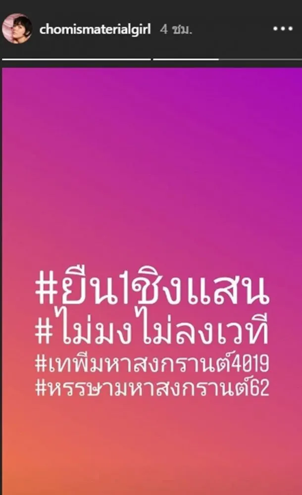 ซึ่งในงานนี้แม่ชมก็จัดแน่นจัดเต็มดูได้จาก Hashtag ทั้ง #ยืน1ชิงแสน #ไม่มงไม่ลงเวที #ยืน1ชิงแสน #เทพีมหาสงกรานต์4019 #หรรษามหาสงกรานต์62 เป็นต้น โดยในงานนี้มีเพื่อนฝูงในวงการอย่าง พิม พิมประภา , แซมมี่ เคาวเวลล์ , ไอซ์ อภิษฎา , ดิว อริสรา , คริส หอวัง , เอมมี่ มรกต ฯลฯ