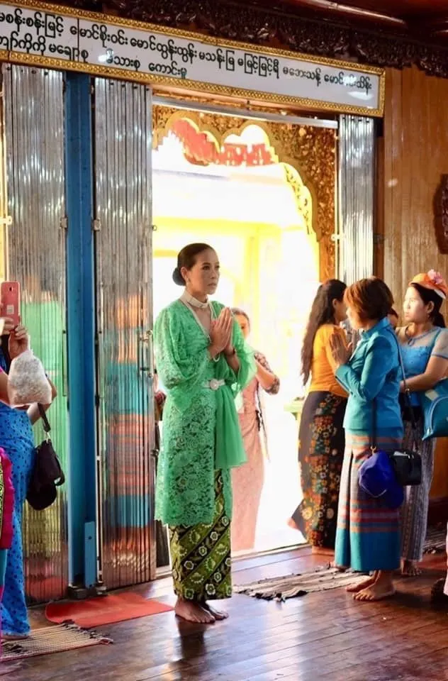 ไหว้พระเสร็จ ต่อด้วยการซื้อดอกไม้ไปถวายพระอุปคุตที่เจดีย์เยเลพญา เมืองสิเรียม ที่พม่า เสื้อชุดนี้ตัดด้วยผ้าลูกไม้สีเขียวของไทย ใส่กับผ้าถุงปาเต๊ะ