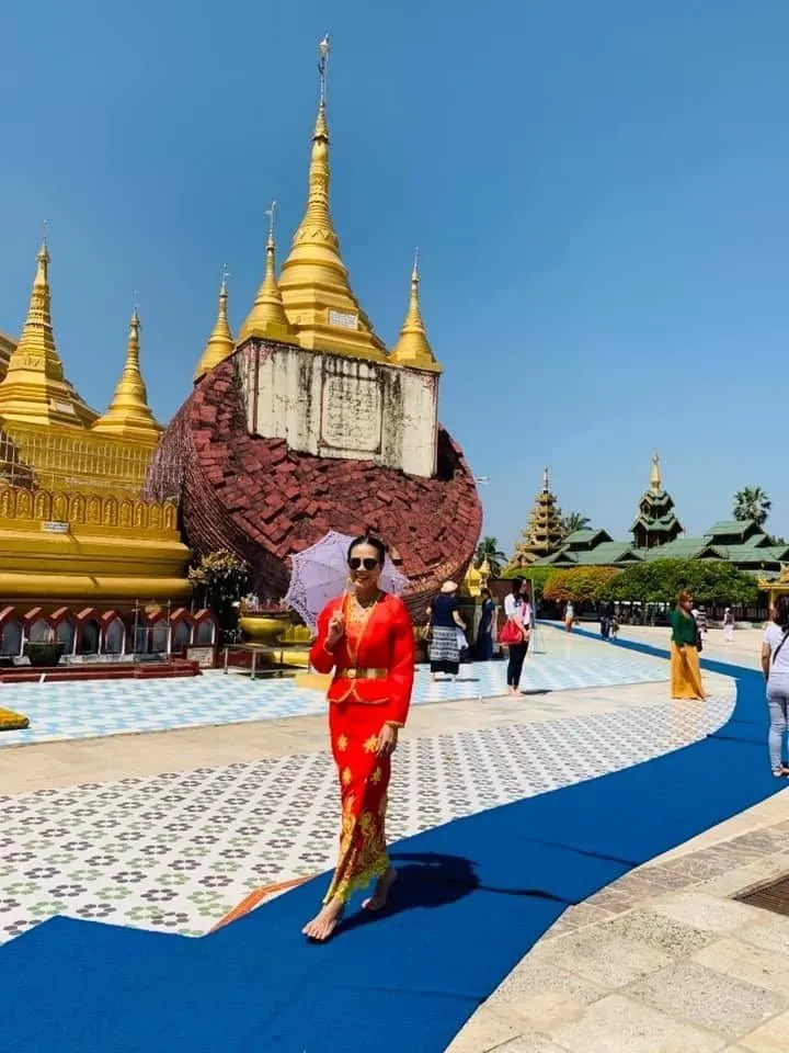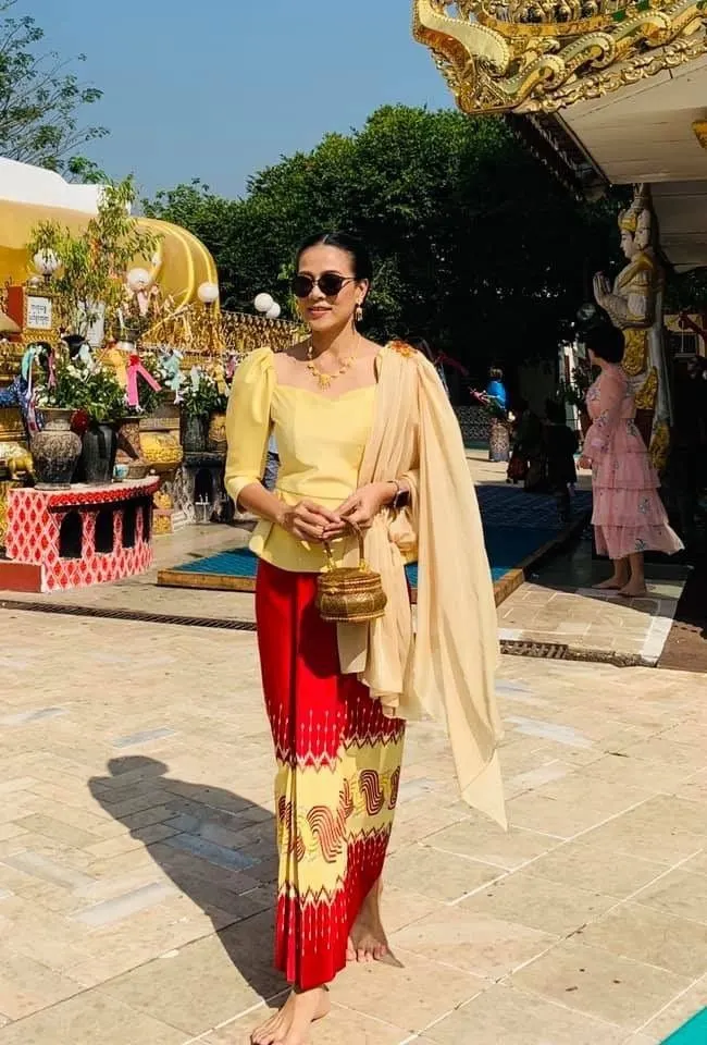 ส่วนชุดนี้ เสื้อตัดด้วยผ้าแก้วของไทย ใส่กับผ้าถุงพม่า ซึ่งกบตัดเป็นชุดไทยเรือนต้น ไปกราบสักการะพระเจดีย์ชะเวมอดอว์ เป็น 1 ใน 5 สิ่งศักดิ์สิทธิ์ของพม่า