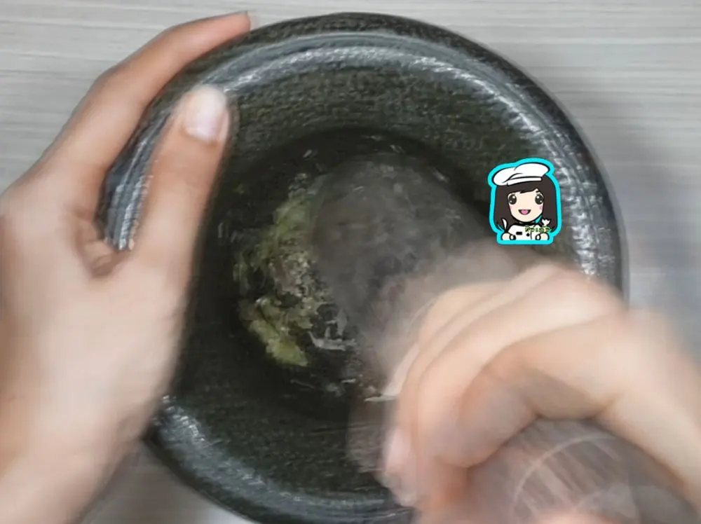 1.ทำสามเกลอ โขลกรากผักชีกระเทียมและพริกไทยให้ละเอียด