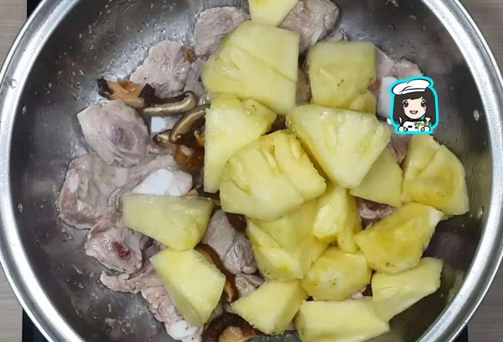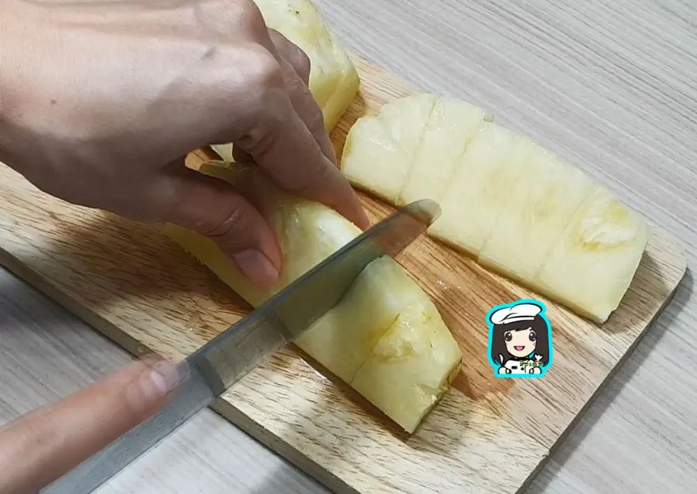 2.เลือกสับปะรดที่มีรสชาติเปรี้ยวอมหวาน ปอกเปลือกหั่นเป็นชิ้นพอคำ เห็ดหอมที่แช่น้ำจนนิ่มแล้วนำมาหั่นเป็นชิ้นๆ