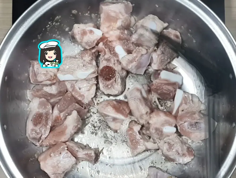 3.ใส่น้ำมันเริ่มร้อนใส่สามเกลอลงผัดให้หอม ใส่กระดูกหมูอ่อน