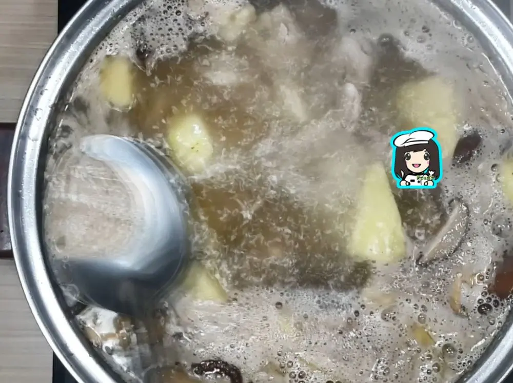 ลดไฟลงมั่นช้อนฟองและน้ำมันที่ลอยออกทิ้ง ต้มประมาณ 30 นาที