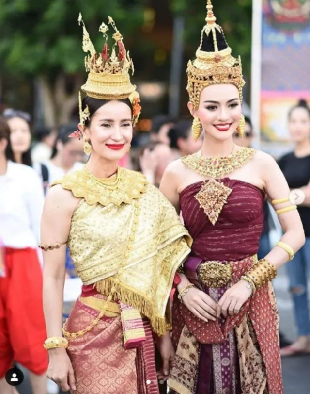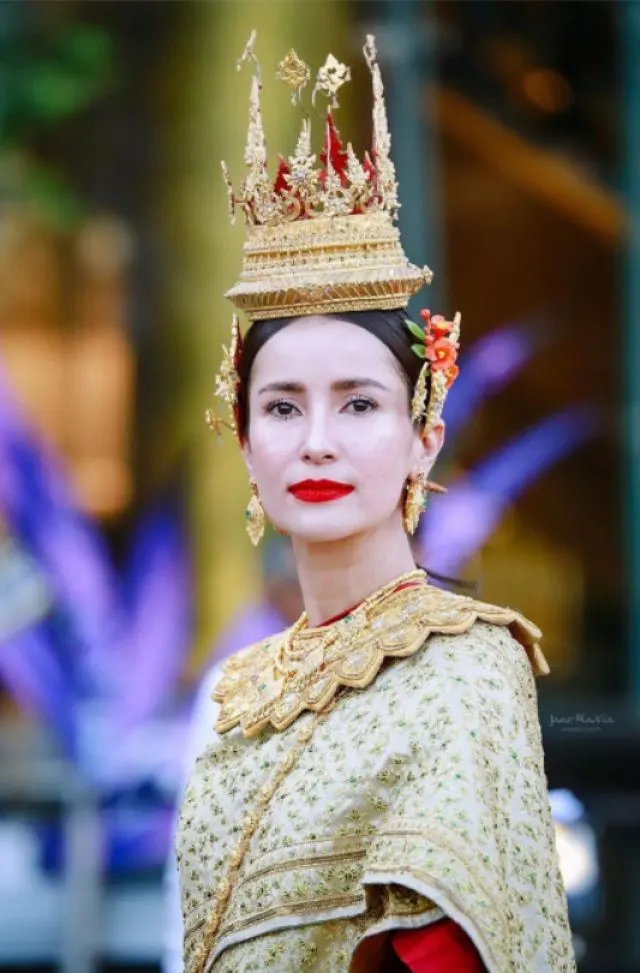 งานนี้สาวแอนแต่งชุดไทย จำแลงเป็นนางสงกรานต์ทุงษะเทวี ห่มสไบอัดจีบสีแดง นุ่งผ้ายกสีแดง ห่มสะพักทอง พร้อมเครื่องประดับทองไทย สร้อยคอมณีนพรัตน์, เข็มขัดสานทองนพเก้า ผลงานระดับมาสเตอร์พีซ สุดยอดฝีมือช่างศิลป์ไทย ทำจากทองคำบริสุทธิ์ 99.99 % น้ำหนักรวมกว่า 200 บาท
