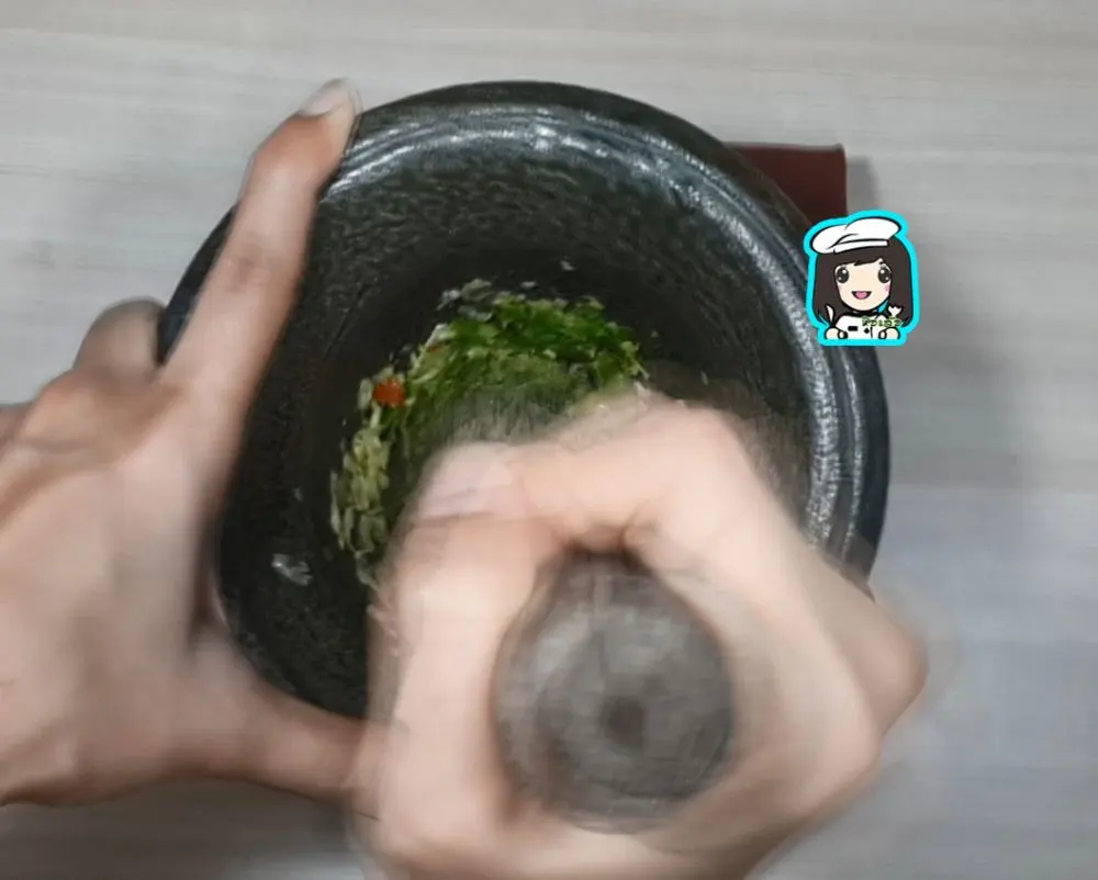 2.โขลกพริกไทย กระเทียม พริกขี้หนู พอหยาบๆ
