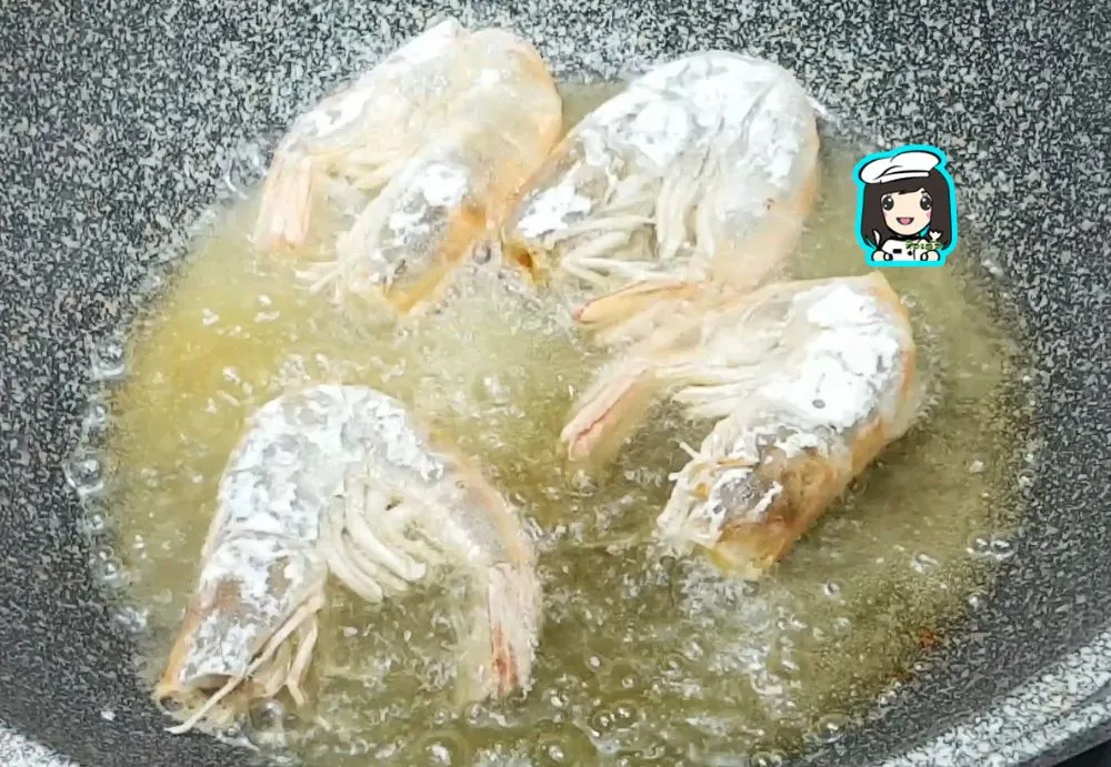 4.นำกุ้งคลุกกับแป้งทอดกรอบ เคาะแป้งออกนำลงทอดในน้ำมันแค่พอสุก สังเกตุให้เปลือกกุ้งกรอบเป็นใช้ได้ ตักขึ้นพักให้สะเด็ดน้ำมัน