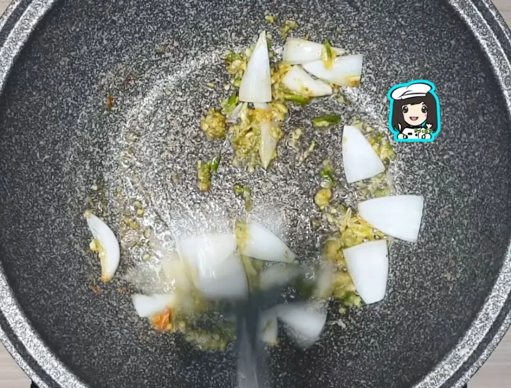5.ตักน้ำมันออกเหลือไว้ประมาณ 2 ช้อนโต๊ะ ใส่พริกกระเทียมที่โขลกไว้ลงไปผัดให้หอม ใส่หอมใหญ่ลงผัดคลุกนิดหน่อย