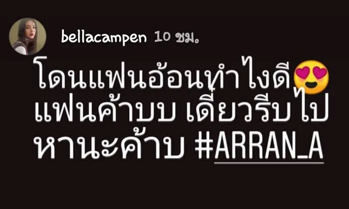 ในขณะที่สาวเบลล่าพอได้เห็นคลิปวีดีโอดังกล่าวก็รีบเข้ามาตอบกลับน้องอลันทันทีเลยว่า “นัดมาเลยค่ะแฟน คิดถึงมากค่ะ” แถมยังเขียนข้อความลงบนช่องอินสตาแกรมสตอรี่ของตัวเองด้วยว่า “โดนแฟนอ้อนทำไงดี แฟนครับ เดี๋ยวรีบไปหานะครับ”