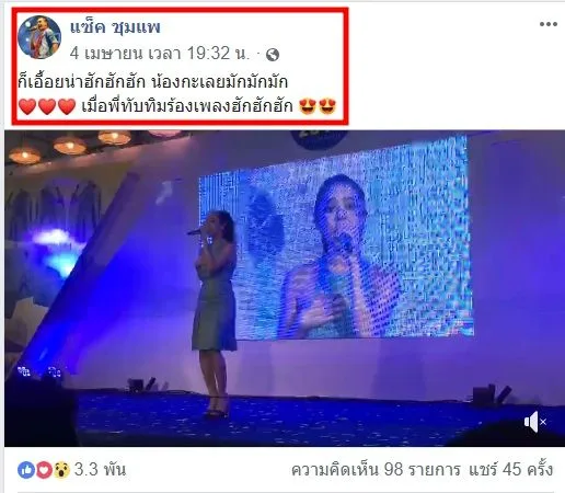 และต่อมา หนุ่มแซ็ค นั้นก็ได้โพสต์คลิปวีดิโอ ของสาว ทับทิม อัญรินทร์ ลงในเฟซบุ๊ค ขณะกำลังร้องเพลง ซึ่ง หนุ่มแซ็ค นั้นก็ได้โพสต์แคปชั่นแซว สาวทับทิม ว่า "ก็เอื้อยน่าฮักฮักฮัก น้องกะเลยมักมักมัก